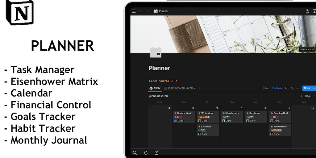 Keep your daily life organized, in this Planner you will be able to control your Tasks, your Calendar, your Goals, your Personal Finances, your Habits and even make monthly reflections!