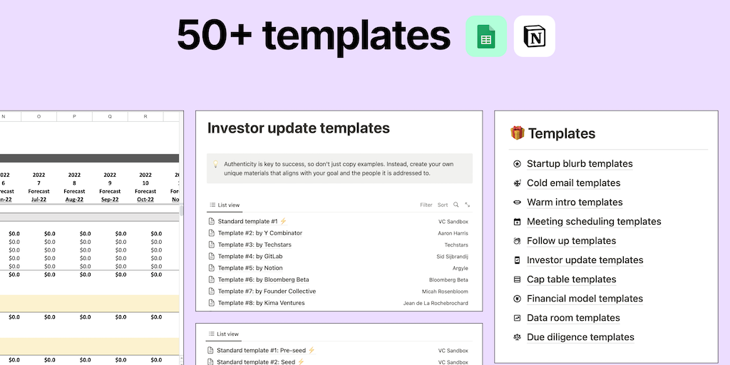 The ultimate Notion guide for startup founders with a fundraising roadmap, 10+ guides, 50+ templates, a list of 30,000+ investors, and the best hacks from tech leaders such as YC, Ramp, Loom, and Cart