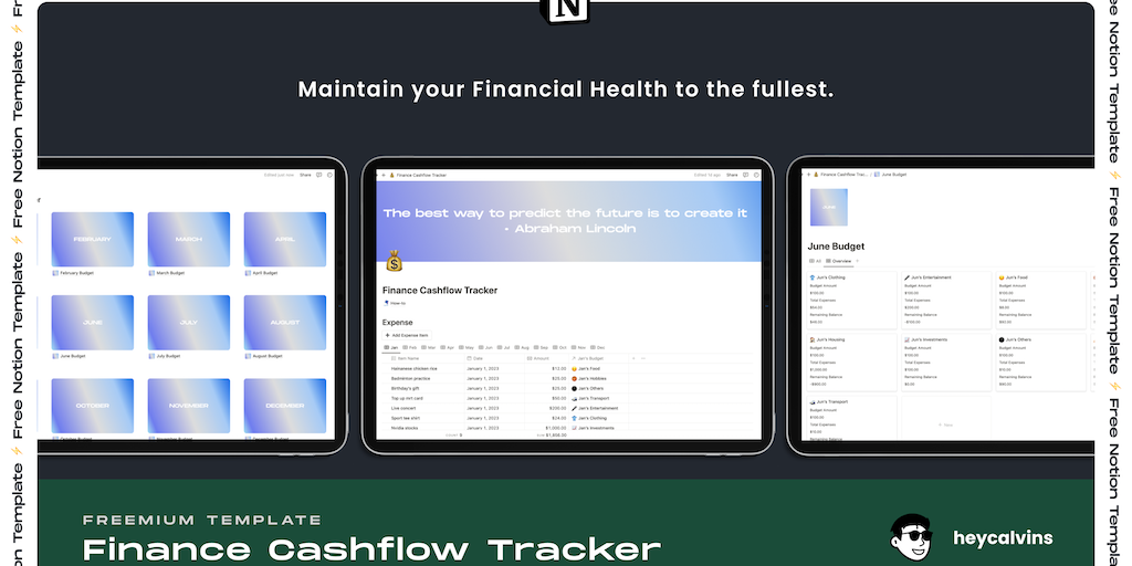 This Notion Finance Cashflow Tracker offers ways to track and navigate your finances through features such as a monthly expense tracker, simple income tracker, and monthly budget tracker.