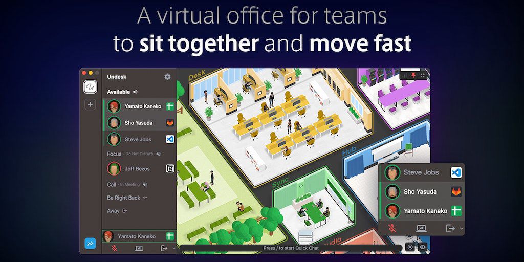 Motivate each other and get more done with the power of presence. Undesk is a virtual office for remote teams to rebuild the office energy, even when the team is in quiet, heads-down, deep work mode.