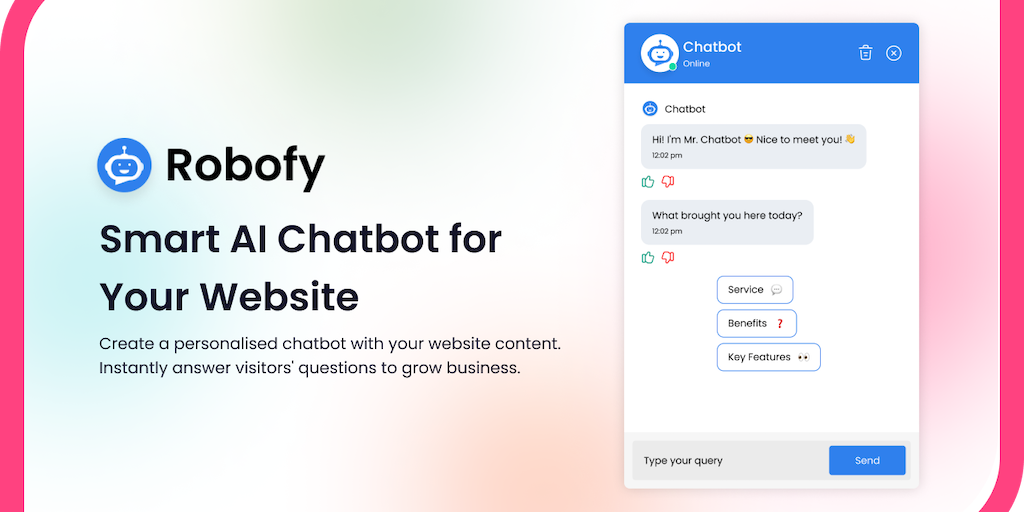 Robofy AI Chatbot uses your website’s content to create a smart and powerful chatbot in a few mins. Your website visitors now won't have to wait long to get their queries answered. Robofy can do it in