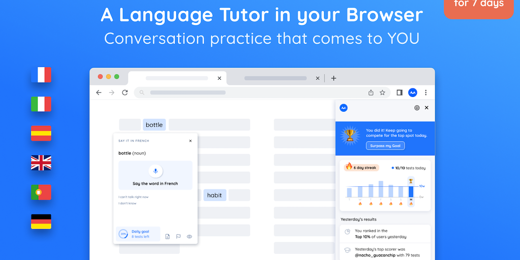 Add language lessons to anything you read online and use AI to nail your pronunciation. Learn to speak faster than ever, without it being a chore. Learn Spanish, French, English, Italian, German or Po