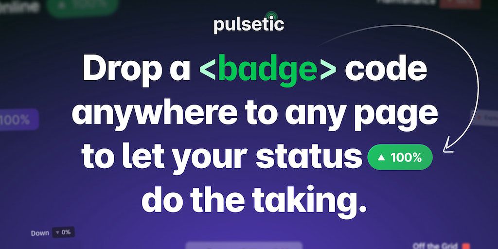 Pulsetic's status badge is a UI element providing real-time updates on website issues including downtime and response time. The badge can be positioned on any page you like, keeping users, staff, and