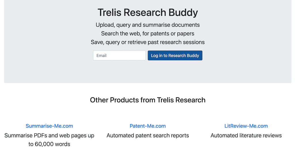 Research Buddy allows you to search the web, patents and academic papers, upload those papers for analysis, and also save your research into a file for later access. Log in by email and try it out for