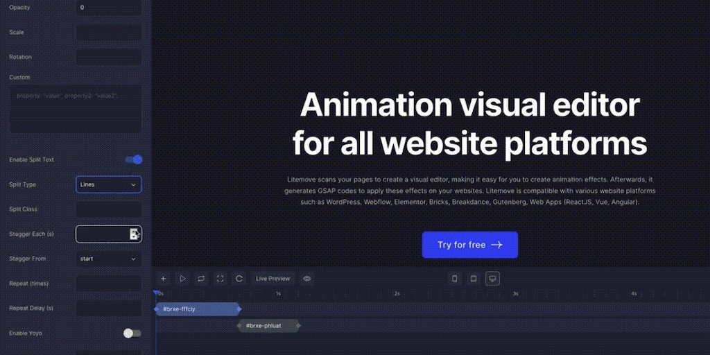 Litemove scans pages for a visual editor to create animation effects. It generates GSAP codes for your websites. Compatible with WordPress, Webflow, Elementor, Bricks, Breakdance, Gutenberg, and Web A