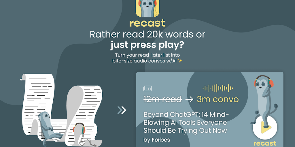 Recast’s AI app helps you “read” without reading. 🎧 Listen to any article as a short podcast 🎙️ Co-hosts explain in real dialogue 📲 Submit any article to convert 🌐 Or browse community recasts 🏃 Keep l