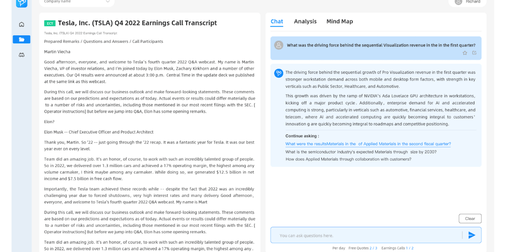 The features we currently offer include: analyzing earnings call transcripts of S&P 500 companies and other star companies, providing financial analysis for a single quarter or multiple quarters. Our