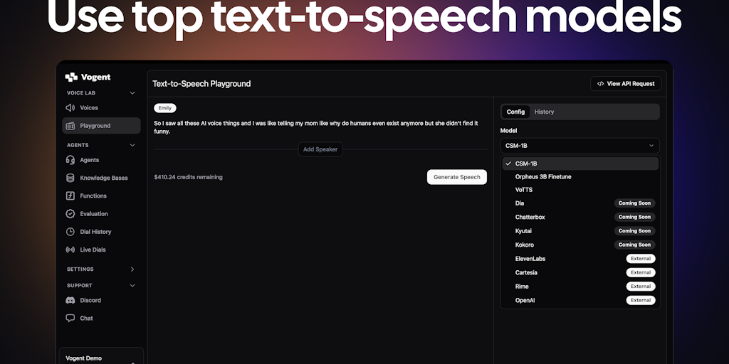 Vogent Voicelab is a platform for optimized inference of top open-source voice models, like Sesame's CSM-1B, Dia, Chatterbox, and more. Voicelab optimizes and post-trains these models to generate cons