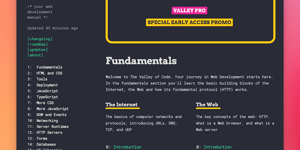 The Valley of Code is a website whose goal is to help you become a Web Developer. The website you can always reference and use as “the place where you go learn quickly how to do X” in your day-to-day