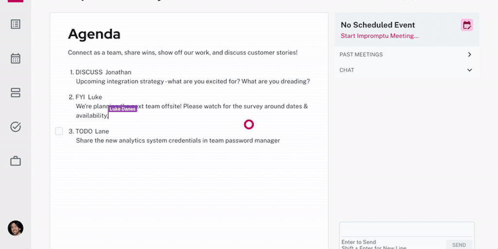 Connect Groupthink to your calendar and instantly create agendas, take notes, and generate action items for team meetings. Key stakeholder can’t attend? Groupthink shares summaries in the easy-to-navi