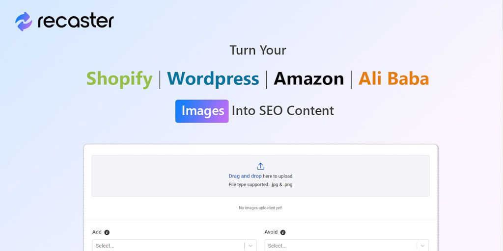 Recaster AI: Your e-commerce assistant generates SEO content from product images. Easily import data for Shopify, WordPress, Amazon, Ali Baba, or custom apps. Recaster AI will produce content for ever