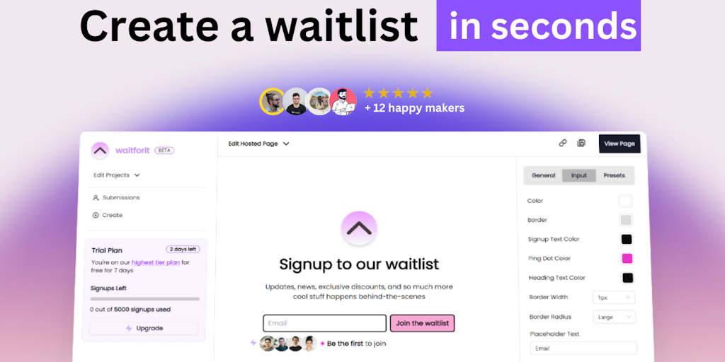 waitforit.me is the no-code waitlist builder for modern product makers who want to ship early and ship fast. We put an end to wasting hours coding, setting up your DB + emails, and designing a waitlis