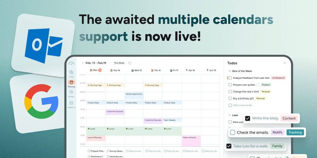 Your favourite AI daily planner is now with Outlook & Google Calendar integrations and multiple calendars support. Explore our new iOS app, seamlessly sync tasks, and conquer goals. Check out our webs