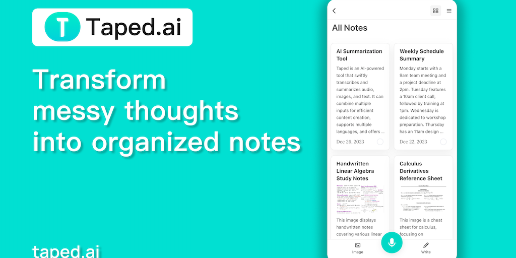 🎉Taped.ai is an AI tool that quickly transcribes,translates and summarizes audio, images, and text. It can transform messy thoughts into organized notes. 🚀With just one click, record or upload images,
