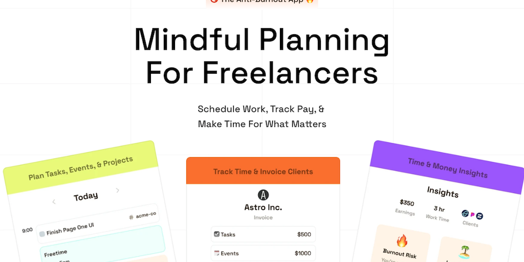 The freelancer's anti-burnout app. Create a holistic schedule that aligns with your preferred pay and work hours. Manage clients, projects, invoices, and time sheets then forecast upcoming pay and rec