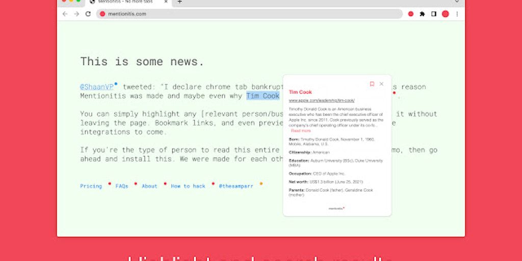 Mentioinitis is a search tool made to streamline the browsing experience by limiting your need for tabs. It reduces cognitive overload by consolidating information. It also has a built-in browser mana
