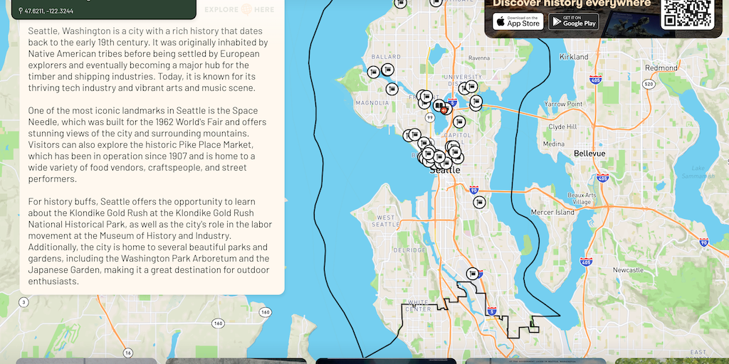 ExploreHere City Search lets you find history around any US City - from there, you can discover over 200k historical markers, explore them on a map and even have interpretive signs read aloud.