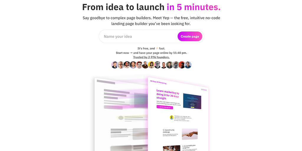 Yep.so - From idea to launch in 5 mins. - A free, no-code landing page builder powered by AI | Product Hunt