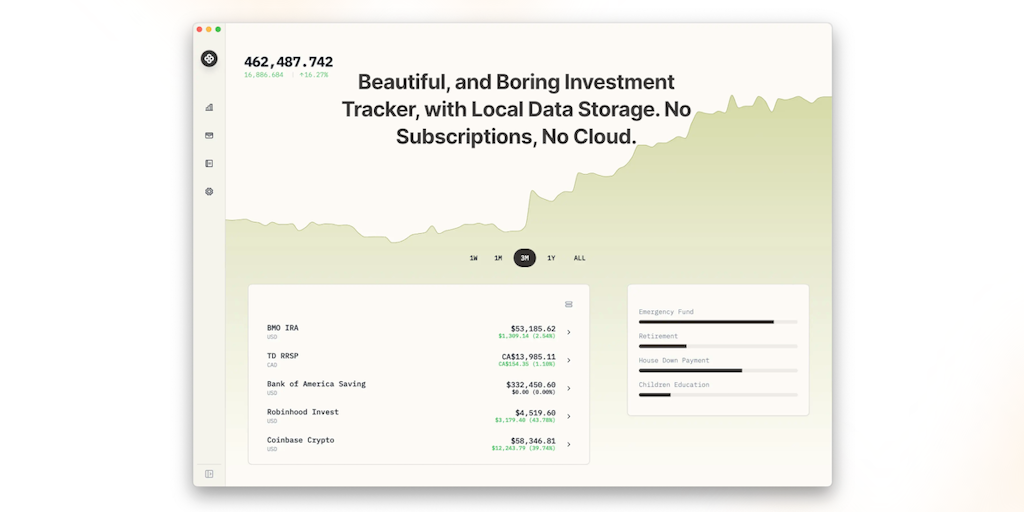 Wealthfolio is a simple, desktop-based investment tracker. Your financial data is stored safely on your own computer. No more worries about SaaS services playing around with your data.
