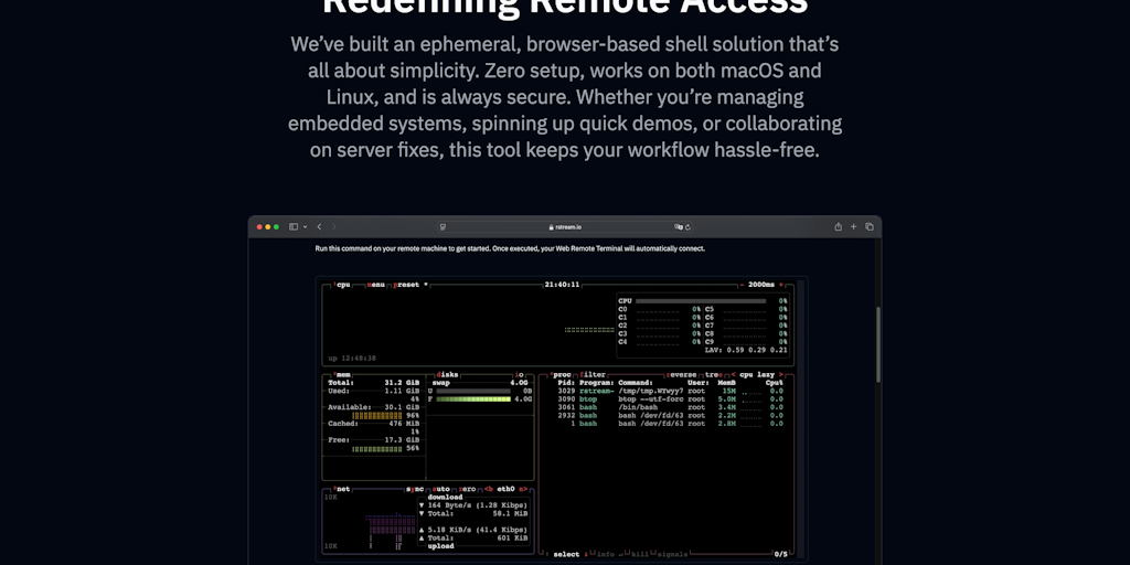 Connect to any Linux or macOS system with a single bash command. Free, no account required. Quickly manage servers, troubleshoot issues, or share a session. All ephemeral and secure. ⚡️️🔒