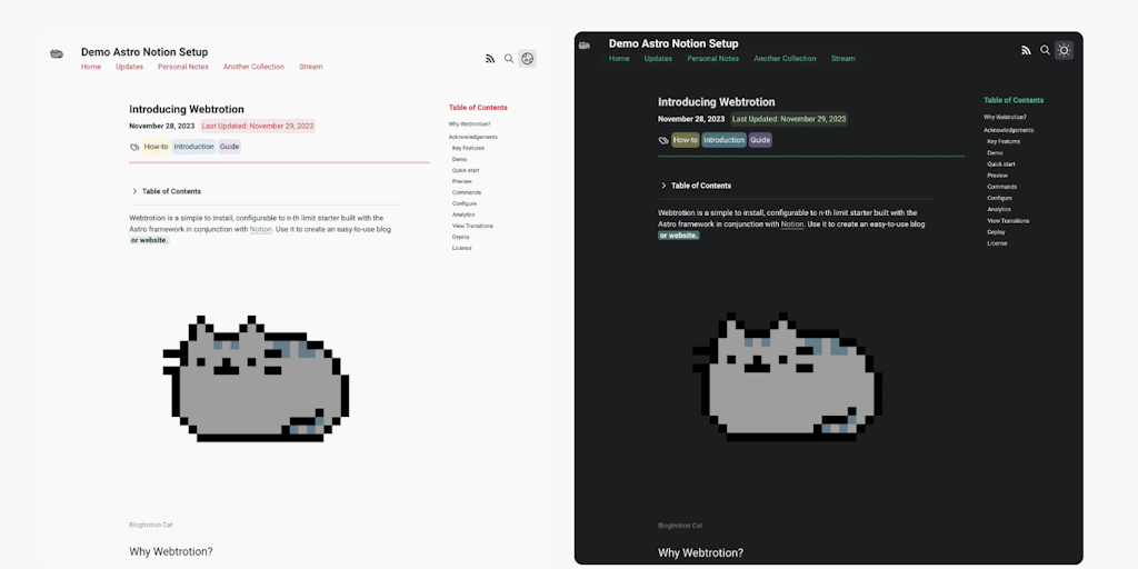 Webtrotion is a highly configurable and easy-to-install website builder, crafted with the Astro framework and Notion. Use it to effortlessly create a blog or website.