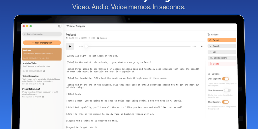 Transcribe videos, podcasts, meetings, and voice memos with the fastest, most accurate AI models—running locally on your Mac or in the cloud with your own API keys. Speaker labels, timestamps, and exp