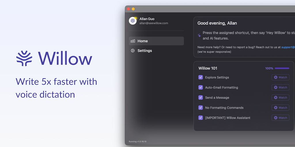 Willow is an AI-powered dictation software that can be used anywhere on your computer. It uses AI to auto-format, correct mistakes, and cut filler words, making your writing faster and cleaner.