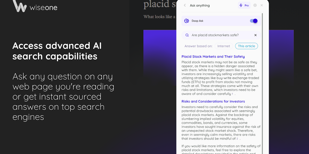 Wiseone Pro is your All-in-one AI tool to enhance web searching & boost reading productivity. With Wiseone Pro, you can: - Access advanced AI search capabilities. - Save hours of reading & improve pro