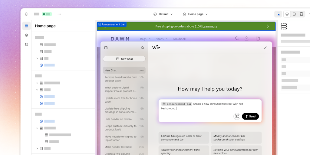 Meet the Cursor for Shopify theme development. Wiz AI brings AI-powered coding directly into your theme editor - no more expensive developers or complex code. Simply describe what you want, and our AI