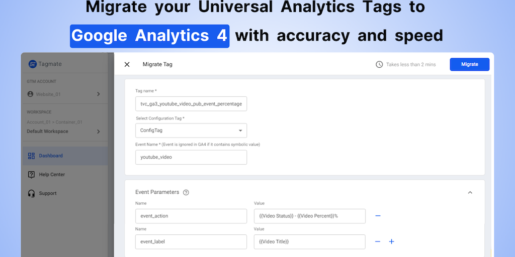 Tagmate Migrator helps you to migrate all of your UA tags to GA4 with precision and speed. Being a low-code/ no-code platform, you don’t need to worry about migrating each tag manually and spend hours