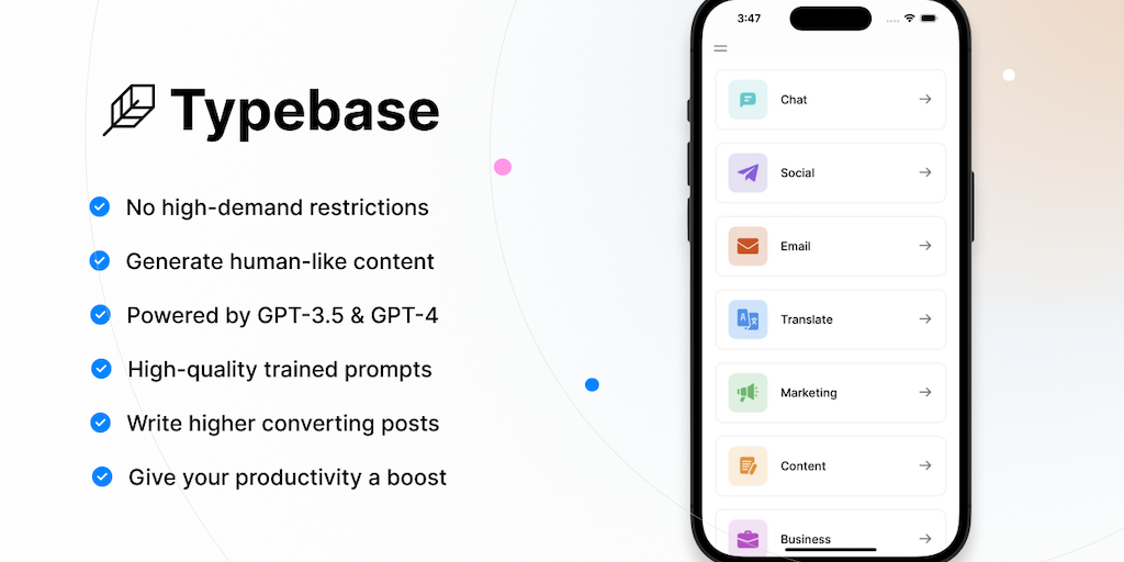 Typebase is the ultimate iOS content generation tool. With advanced support for GPT 3.5 and GPT-4, effortlessly create high-quality content in seconds. Streamline your content creation process and exp