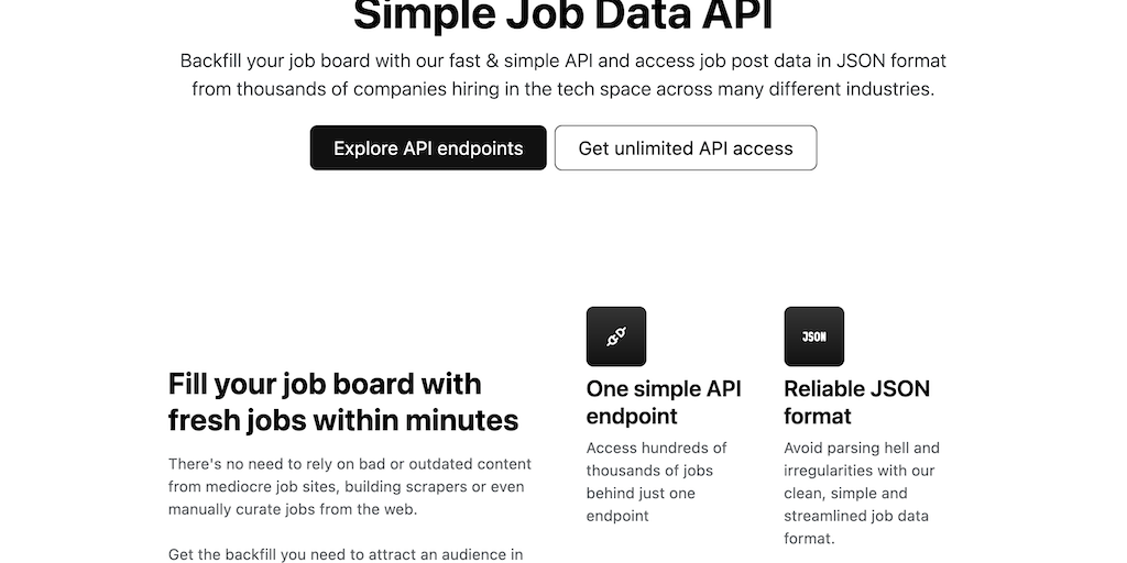 Backfill your job board with our fast & simple API and access job post data in JSON format from thousands of companies hiring in the tech space across many different industries.