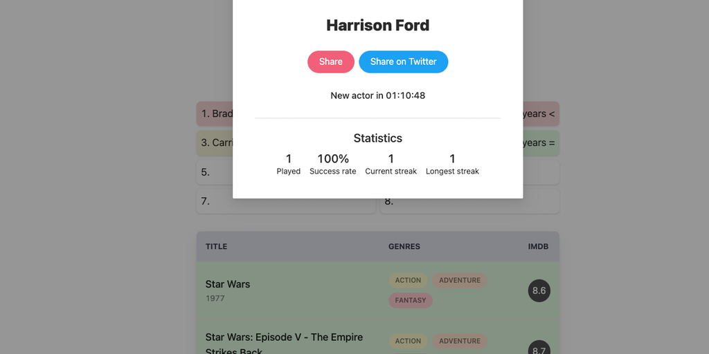 Actorle is a movie guessing game inspired by Wordle. You have 8 guesses to find the actor of the day based on their movies.