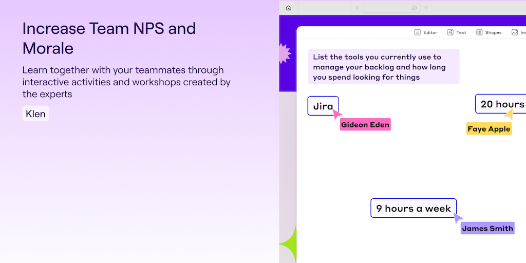 Klen gives you access to fun and collaborative team building workshops and exercises for your hybrid or remote team. Learn together and boost team morale on Klen.