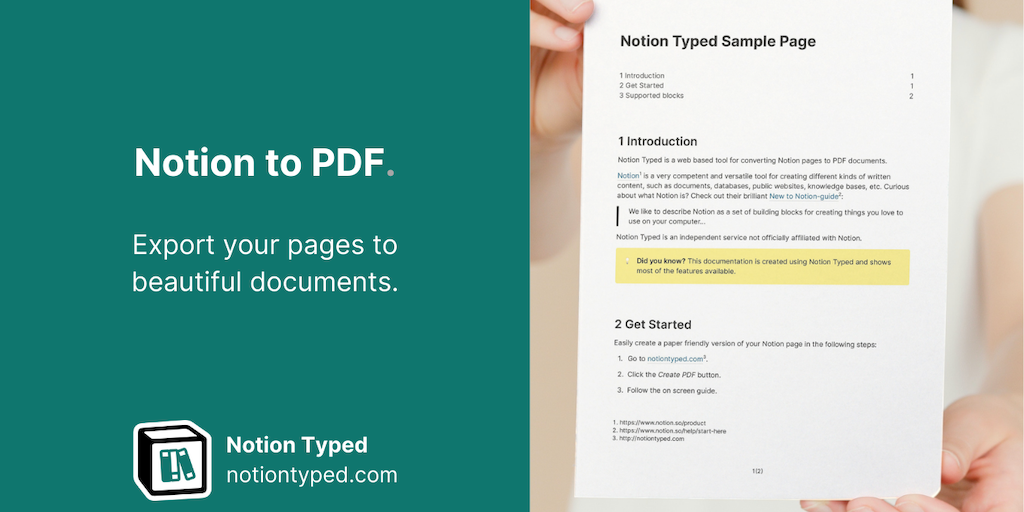 Notion Typed is a web based tool for converting Notion pages to PDF documents. Although the official Notion app features similar export functionality, Notion Typed brings additional features, making y