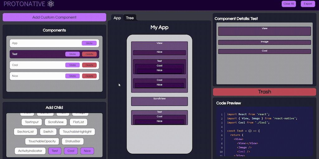 ProtoNative is a free, open-source application for creating a React Native prototype. It allows users to quickly and easily create the skeleton of their app, by creating custom components, and using t