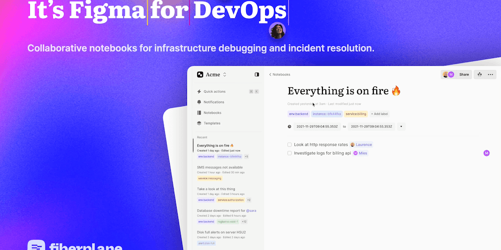 Fiberplane puts a programmable SRE environment at the fingertips of engineers, redefining collaboration for infrastructure teams. It offers collaborative investigation & documentation with real data,