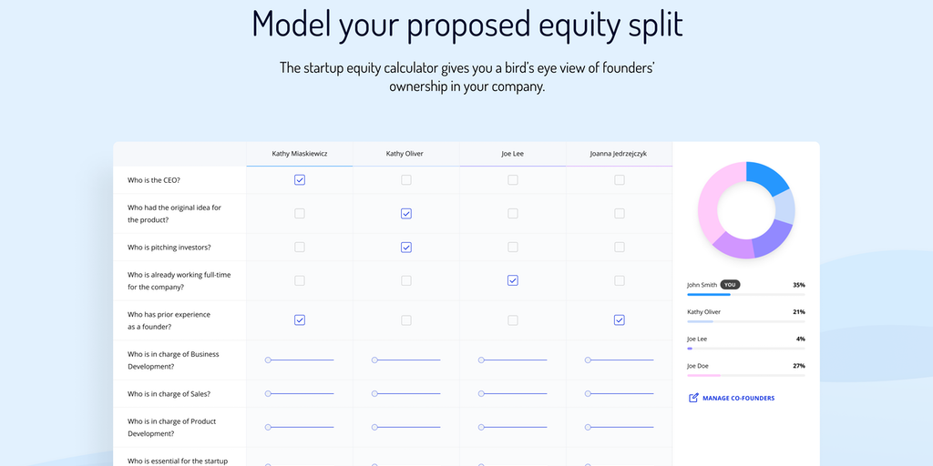 The Startup Equity Calculator collects information on each of your co-founders’ roles and responsibilities, and proposes a fair equity split to make everyone happy. A free tool from Capbase, makers of