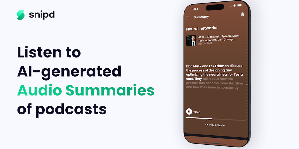 Snipd is an AI-native podcast player built to discover and save the best ideas in podcasts. Today, we're launching AI-generated audio & text summaries of full podcast episodes, starting with all episo