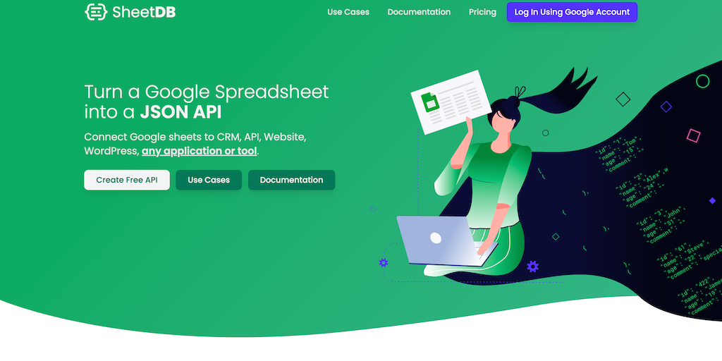 SheetDB is a tool that lets you transform your Google Spreadsheet into a fully functional JSON API in a snap. You can connect your Google Sheets with pretty much anything like CRMs, APIs, websites, Wo