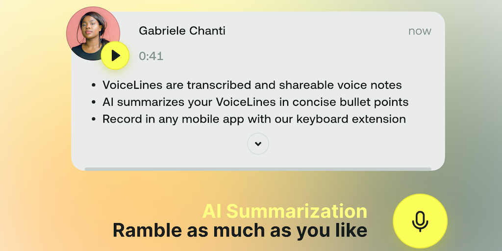 VoiceLines joins the warmth of your voice with the efficiency of text. Our AI summarizes fuzzy rambling into concise bullet points, available within any mobile application using our keyboard extension