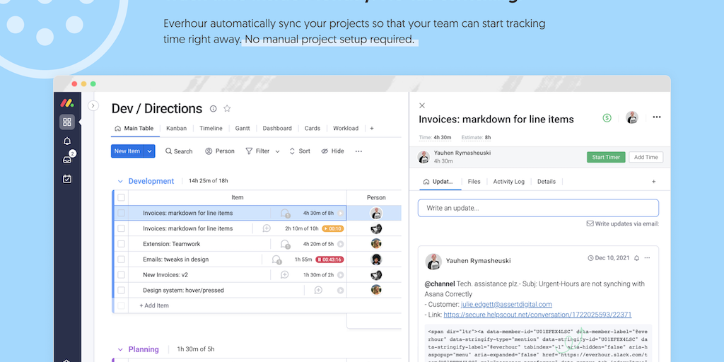 Everhour embeds controls into the Monday.com interface and extends it with many valuable features for time tracking and payroll! Track time using the timer or log time manually.