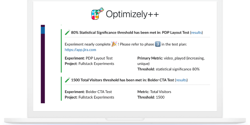 Slack+Optimizely integration that notifies your experimentation teams in Slack as their experiments achieve critical milestones for statistical significance, visitor reach and more.