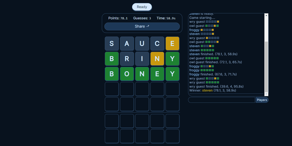 WordHoot is a word guessing game inspired by Wordle. Featuring competitive multiplayer, unlimited plays & guesses, playing history & stats, and a points system.