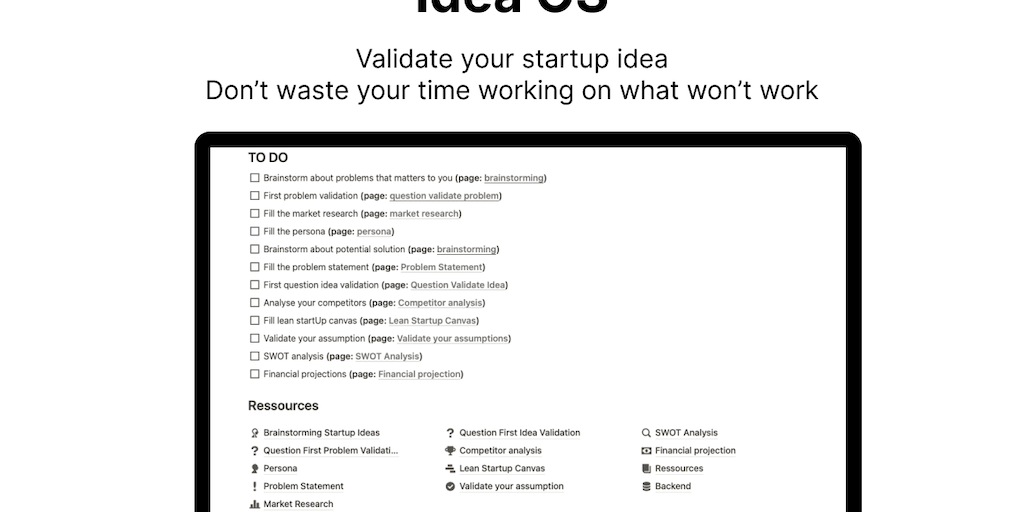 Idea OS is a powerful template designed to help you validate your startup idea. Whether you're have an idea or not, this template provides toolkit to brainstorm & validate your idea.
