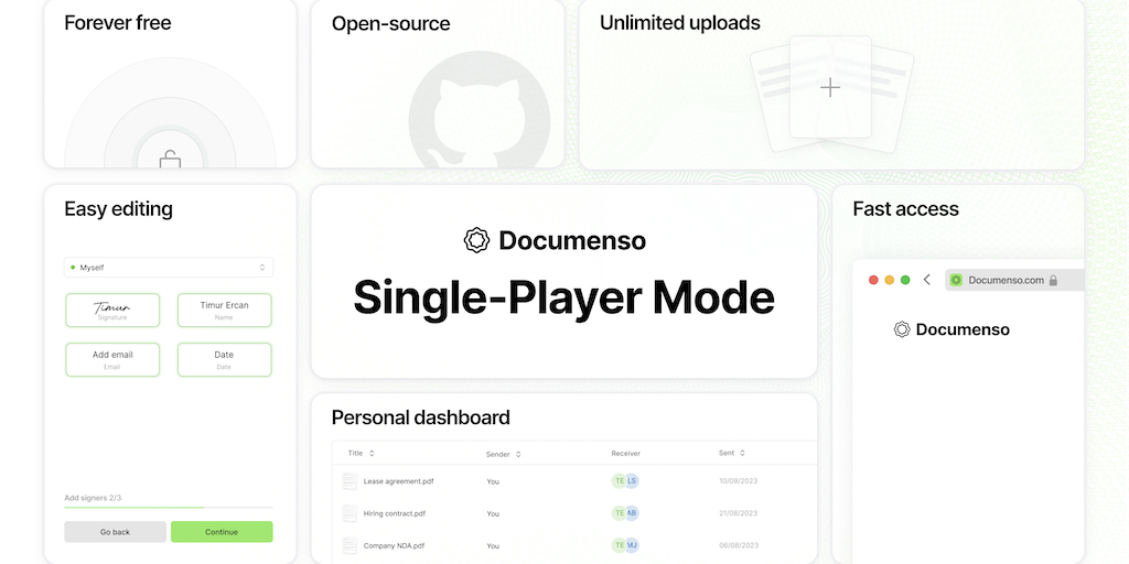 Documenso Single Player Mode is a new, free-signing experience. You can now sign documents alone for free without even creating an account!