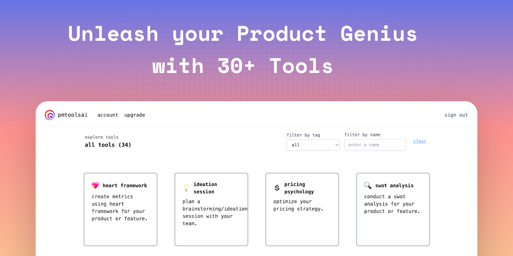 PMToolsAI is a collection of 30+ tools (AI prompts and execution) that help product managers with ideation, market sizing, defining the roadmap, north star metrics, SWOT analysis, JTBD statements, cus