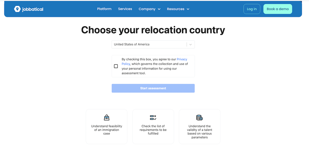 Jobbatical's AI powered assessments, can determine if your employee can be relocated to your location. In a few minutes, without any immigration knowledge or lawyer fees.