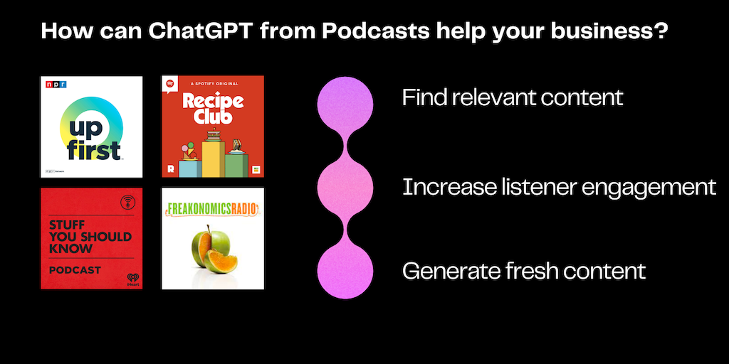 Bring the power of podcasts and other audio content to your own ChatGPT-4 chatbot. No IT support required. You'll get responses based on your podcast content & other business content — without the bot