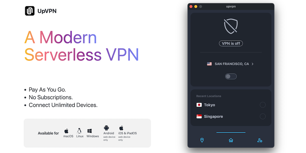 UpVPN is the World’s first Serverless VPN based on WireGuard®. The benefit of Serverless model of computing for VPN is passed to you via no-subscription, pay as you go pricing model, and UpVPN lets yo
